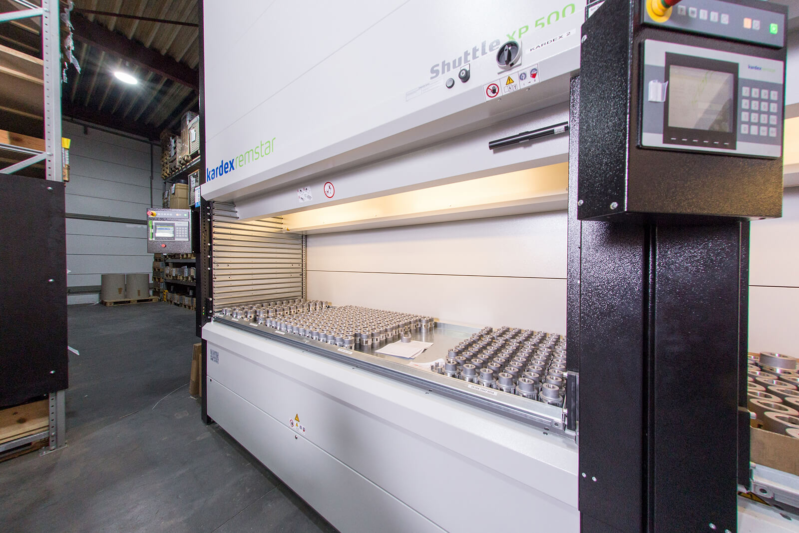 In October of last year, the dispatch and raw material stock were newly structured. Due to the investment in two fully automated lift systems type KARDEX Shuttle XP500, the stocking capacities have been significantly expanded. On a base area of only 17 square meters, 67 tons of small parts can be stocked up to a height of six meters. Thus, the retrieval and packing times are being significantly reduced. Structural modifications were not necessary. The purchase of a third system is planned for mid of this year.